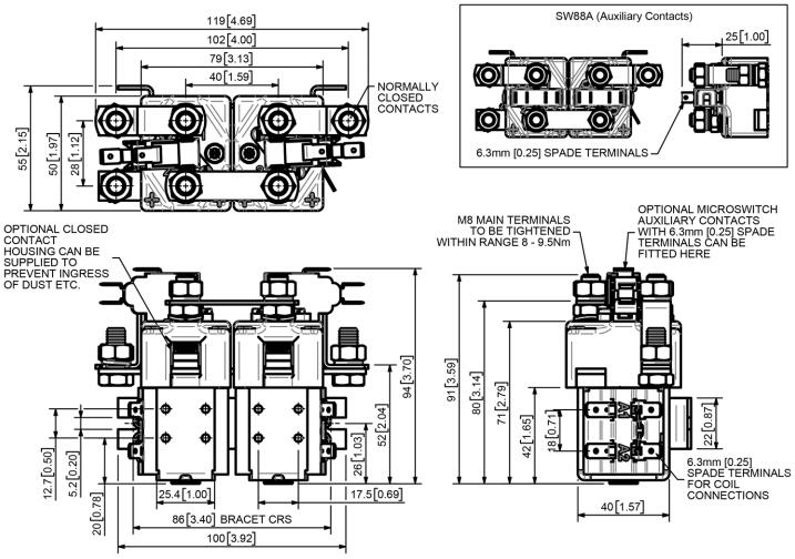 SW92的特点是单极双重断开主触点,银合金尖端,耐焊接,耐磨损,并具有优异的导电性。 SW92具有M8螺栓主端子和6.3mm的黑色线圈连接。 通过M4螺纹孔或安装支架进行安装,或者提供安装,或作为单独的物品。 安装可以是水平或垂直的,垂直时M8接触螺栓应该朝上。 如果要求向下定位,我们可以调整接触器来补偿这一点。